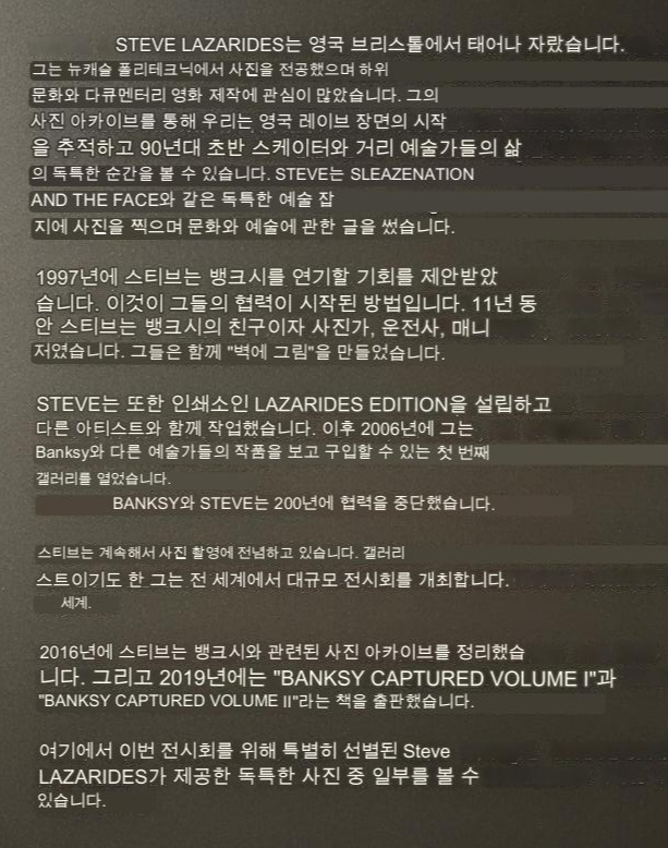 전시회의 시작은 스티브 라자리데스(STEVE LAZARIDES)의 사진으로 시작합니다. 그는 출판가, 사진가, 수집가 및 큐레이터로 뱅크시와는 1997년부터 2008년까지 11년 동안 함께 작업한 것으로 알려져 있습니다. 아래 설명 사진은 영어를 구글 이미지 번역을 통해 작성한 내용입니다. 그에 대해 조금 더 궁금하신 분들을 위해 아래에 스티브 라자리데스에 대한 위키백과 링크를 남겨 두었습니다.
